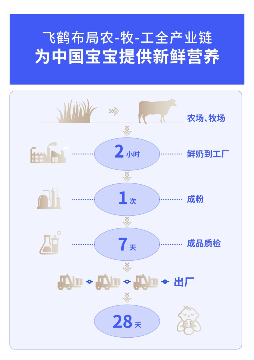 依托全产业链优势,飞鹤打造了“2小时生态圈”,将智能工厂建在自有牧场周边,通过全自动化设备采集鲜奶,将鲜奶在十分钟内降低至4℃,每一滴新鲜生牛乳从挤奶到加工成粉全程不超过2小时。同时,飞鹤联合第三方创新模式,实现产品从牧场到餐桌“28天新鲜直达”,最大化保留了鲜奶关键活性营养,给宝宝极致新鲜,更充分的营养。
