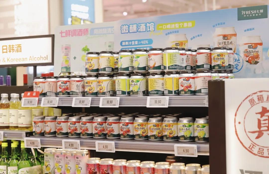 其次是规模化采购。依托京东体系的庞大流量与门店布局规模,京东七鲜对酒类产品实行规模化采购,比如与酒厂签订直供协议,直接封罐500吨专属酒体,通过规模化采购压降成本,同时也降低了物流、仓储的单位成本。