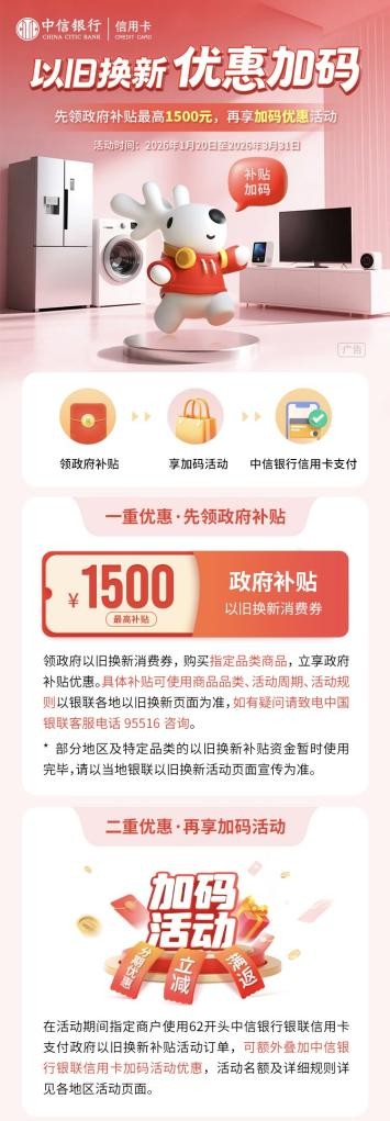 2025年中央经济工作会议明确2026年将继续实施“国补”政策,为消费活力释放注入“强心剂”。当前全国各地“以旧换新”补贴政策正陆续落地,春节作为传统消费旺季,消费者家具家电、电子设备等大件购置需求旺盛。对此,中信银行信用卡推出“以旧换新,优惠加码”专项优惠活动,用户在领取最高1500元政府补贴之外,还可额外叠加享受中信银行银联信用卡加码活动优惠,目前活动已在已在全国多地上线,为人民群众美好生活“焕新”增添暖意。