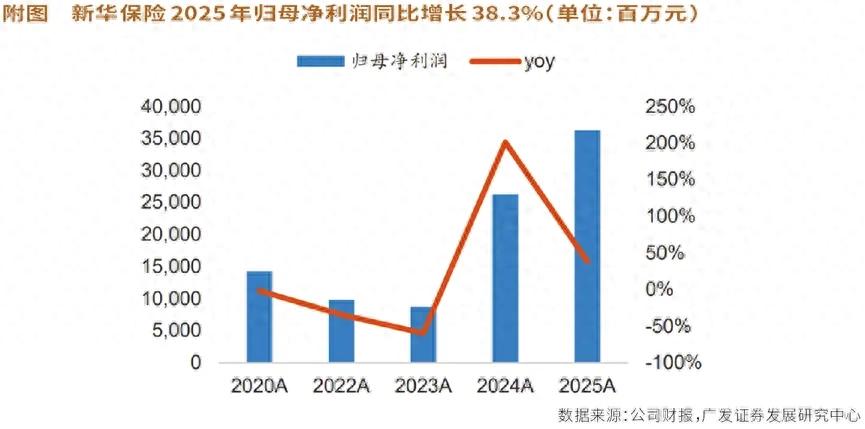 受益于投资端表现与负债端提质,新华保险2025年实现归母净利润362.84亿元,同比增长38.3%,在五大上市险企中位居第二,主要得益于投资收益增加、业务结构优化及费用管控成效。