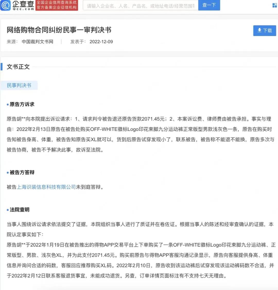 据企查查网络购物合同纠纷民事一审判决书显示,其中法院查明:原告胡某某于2022年1月19日在被告推出的得物APP交易平台上下单购买了一条OFF-WHITE徽标L ogo印花束脚九分运动裤、正常版型、男款、浅灰色XL,并为此支付2071.45元。购买前原告与得物APP客服沟通记录显示,原告向客服提供身高、体重信息并询问合适的码数,客服回应推荐购买XL码。