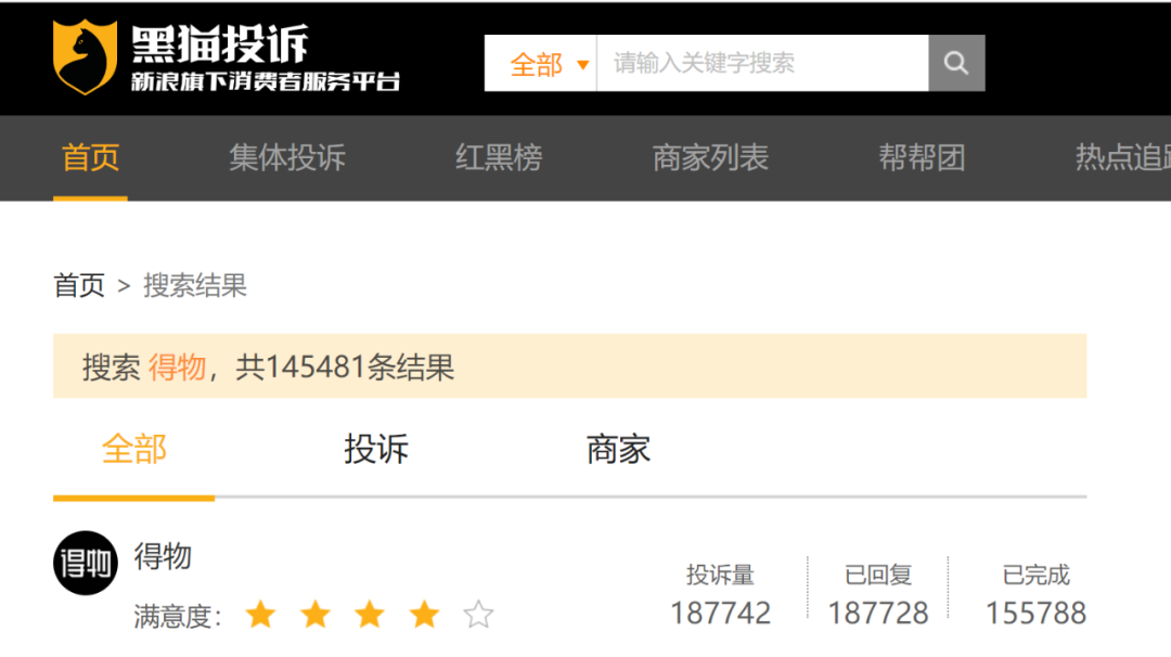 不少买家表示买到了假货,据黑猫投诉平台显示,得物累计投诉量187741;累计回复量187727;已完成量15788。很多涉及“产品质量差”、“假货”、“鉴定服务不靠谱”、“退货难”等。