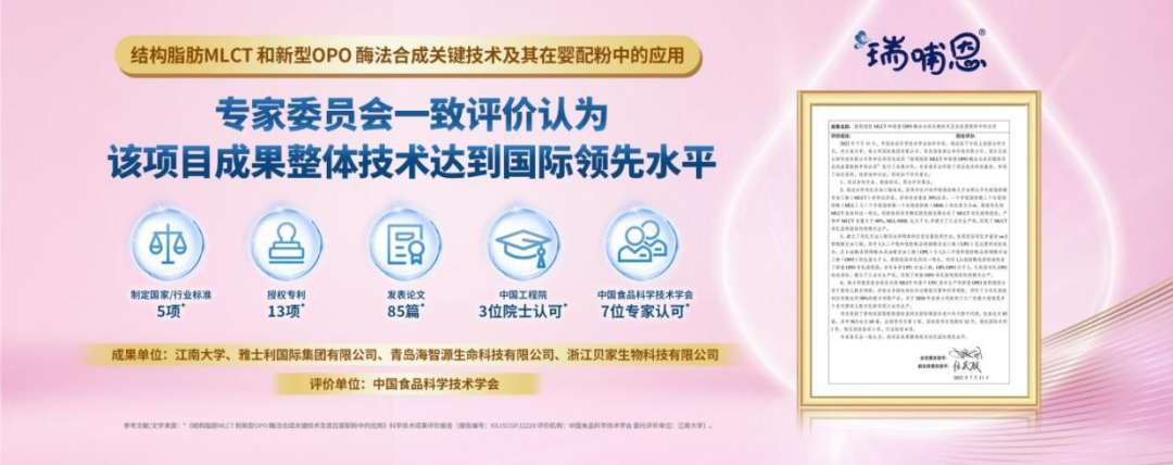 据悉,MLCT结构脂的营养价值及功效备受学界认可,其应用通过国家权威机构鉴定,被一致认为打破了西方多年的技术垄断,解决了婴幼儿配方乳粉核心脂肪配料的“卡脖子”问题,刷新中国母乳研究新高度,整体达到国际领先。此外,MLCT结构脂更是新国标目前唯一获批写入配料表里的创新成分。