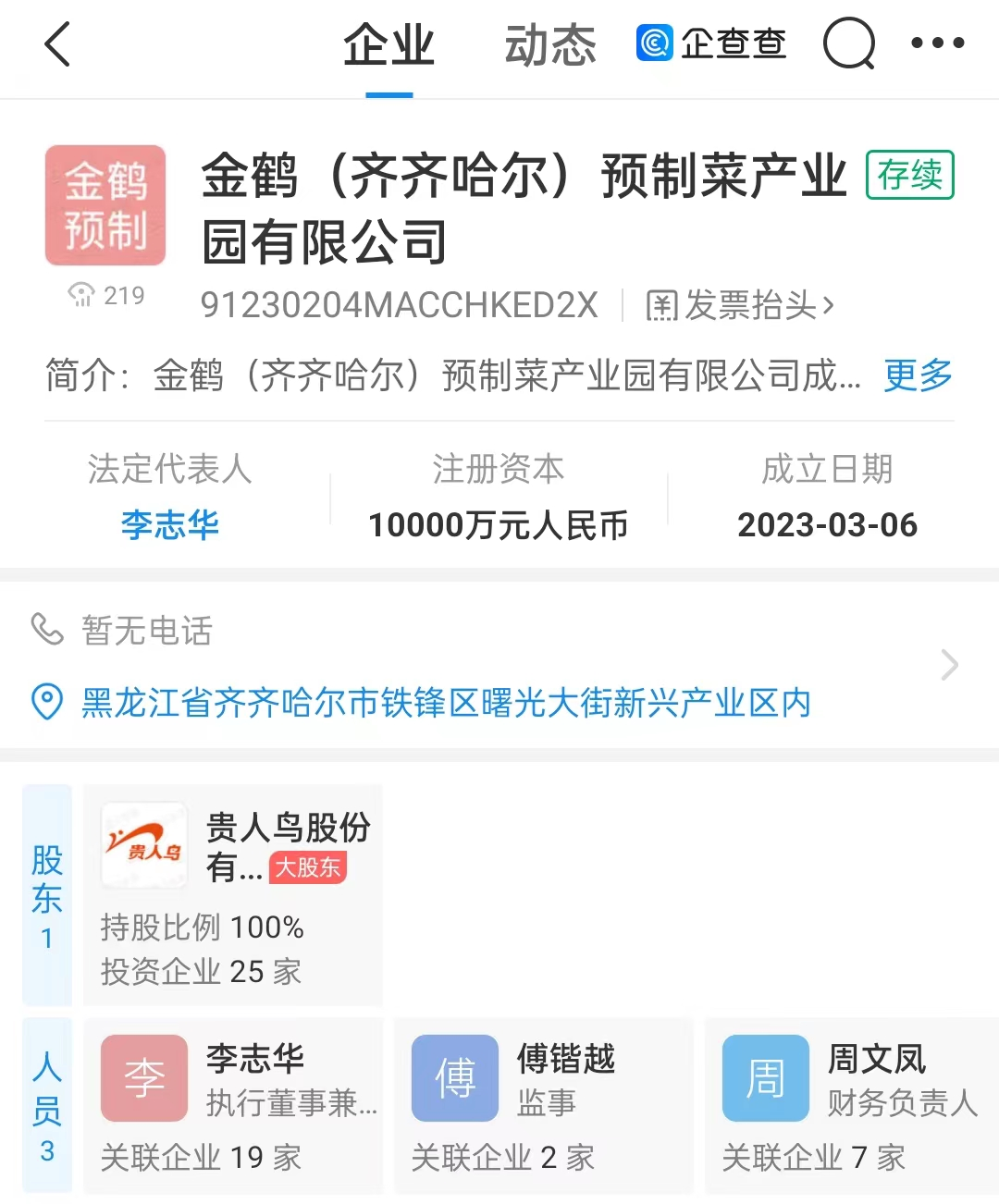 近日,贵人鸟花费1亿元成立预制菜产业公司。据企查查APP显示,2023年3月6日,金鹤(齐齐哈尔)预制菜产业园有限公司成立,注册资本1亿元人民币,法定代表人李志华,经营范围包含:初级农产品收购;粮食收购;谷物种植;小微型客车租赁经营服务等。企查查股权穿透显示,该公司由贵人鸟100%控股。