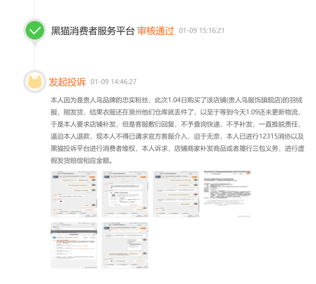 值得一提的是,贵人鸟近期的投诉也有不少。黑猫投诉平台显示,2023年1月9 日,一位网友在1月9日投诉称“贵人鸟旗舰店虚假发货不予补发赔偿,逾期不发货,虚假发货,客服态度差,未履行国家规定的三包”。该网友称自己是贵人鸟品牌的忠实粉丝,但1月4日购买了该店铺的羽绒服后,遭遇到了仓库丢件,于是他要求店铺补发,但他认为客服敷衍回复,不予查询快递,不予补发,一直推脱责任,甚至“逼迫本人退款”。他的诉求是店铺商家补发商品或者履行三包义务,进行虚假发货赔偿相应金额,相关涉诉金额为251元。
