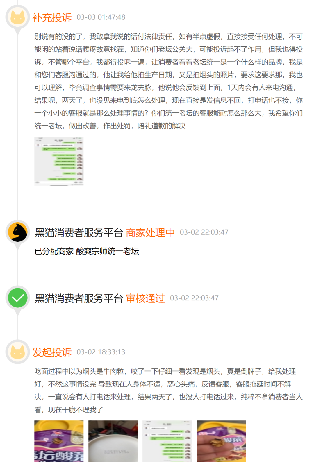2023年3月2日,有网友投诉“吃统一老坛酸菜面,吃面过程中以为烟头是牛肉粒,咬了一下仔细一看发现是烟头,真是倒牌子,给我处理好,不然这事情没完 导致现在人身体不适,恶心头痛。”