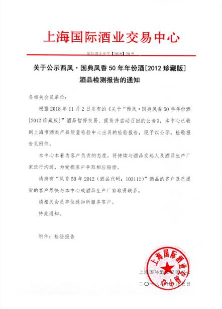 11月2日,上海国际酒业交易中心发布了西凤年份酒暂停交易、提货并启动召回的公告。据公告内容,该机构收到客户反映,西凤年份酒存在塑化剂超标嫌疑,因此发布质检和召回公告,并与波及的各方启动理赔程序。
