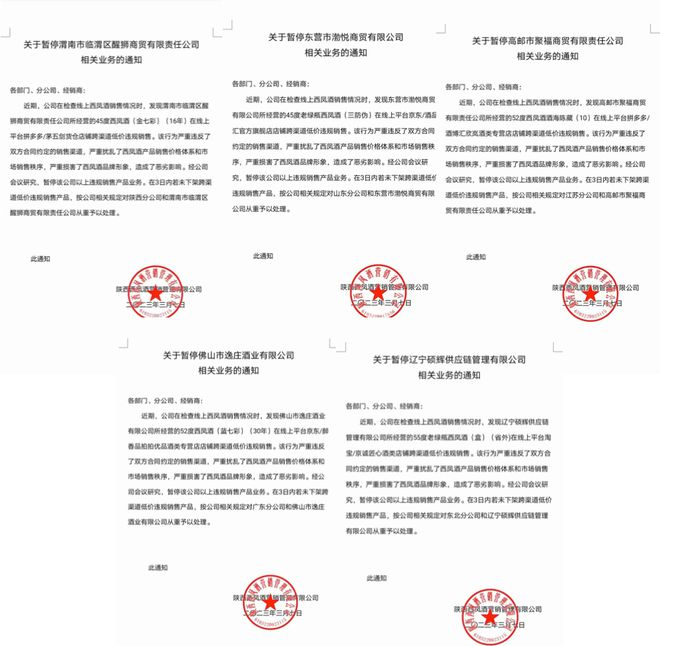 2023年3月7日,20天内西凤酒开出5张处罚通知,暂停了与佛山市逸庄酒业有限公司、辽宁硕辉供应链管理有限公司、高邮市聚福商贸有限责任公司、渭南市临渭区醒狮商贸有限责任公司、东营市渤悦商贸有限公司共5家经销商的违规销售产品合作。
