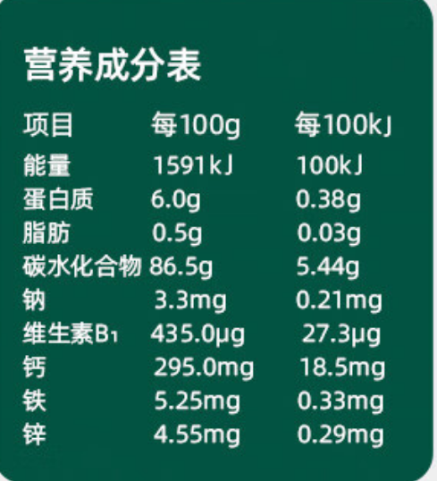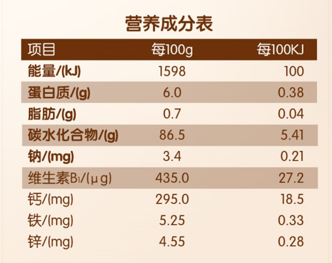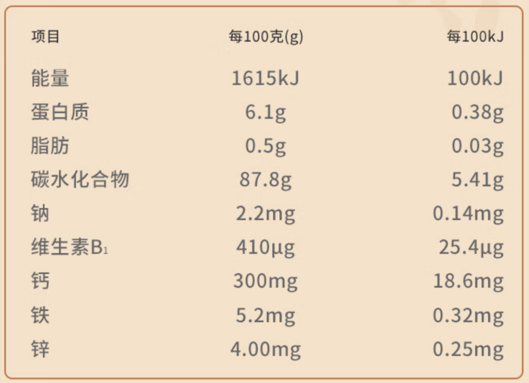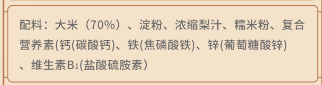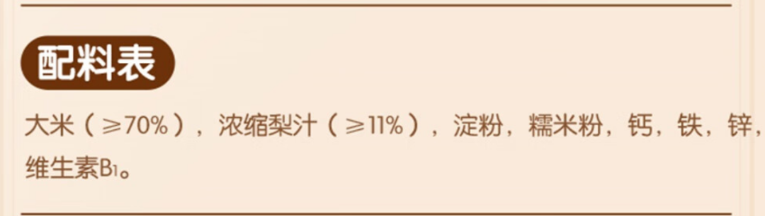 配料为大米(70%) 、淀粉、浓缩梨汁、糯米粉、复合营养素(钙(碳酸钙)、铁(焦磷酸铁)、锌(葡萄糖酸锌)以及维生素B1(盐酸硫胺素)。