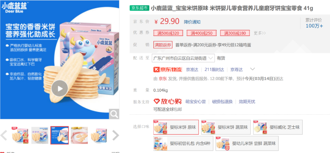 小鹿蓝蓝_宝宝米饼原味 米饼婴儿零食营养儿童磨牙饼宝宝零食 41g,29.9元。