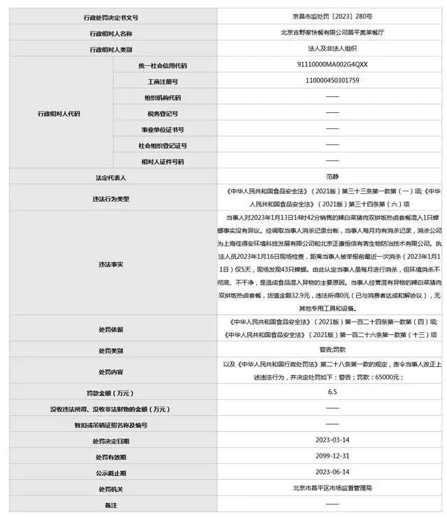 值得注意的是,不仅网红餐厅出现食品安全问题,就连老牌餐厅也出现了类似的问题。2023年3月14日,北京市市场监督管理局网站披露,北京吉野家快餐有限公司昌平奥莱餐厅因违反食品安全法,被北京市昌平区市场监督管理局警告、罚款6.5万元。