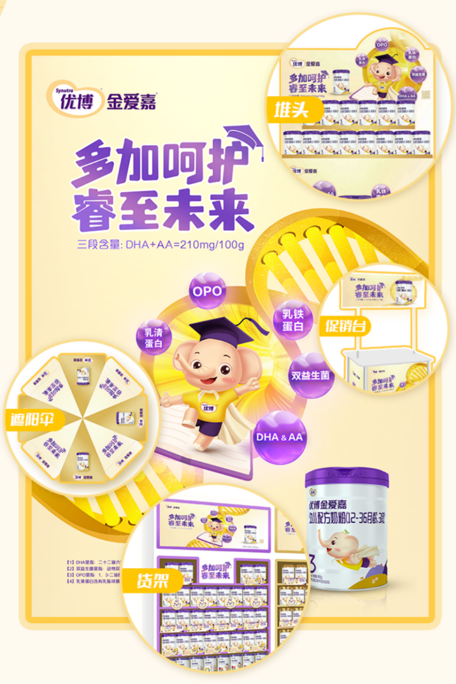 除配方与罐体包装之外,优博金爱嘉也对品牌全套视觉物料进行了全面迭代更新,如宣传海报、货架物料、堆头、帐篷、遮阳伞、四折页、手提袋等,整体视觉画面清新灵动,以优雅美学释放品牌亲和力,拉近与消费者之间的距离,同时精准赋能线下终端营销。