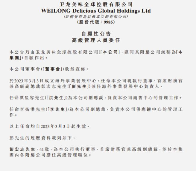 除此之外,卫龙在海外布局方面也做了不少努力,以点为基础,稳步扩散布局全球市场。2023年3月3日卫龙宣布成立海外事业发展中心,任命公司现执行董事、首席财务官兼高级副总裁彭宏志兼任海外事业发展中心负责人。任命洪星容为公司副总裁,负责公司销售中心的管理工作。任命李卫洪为公司副总裁,负责公司供应链中心的管理工作。