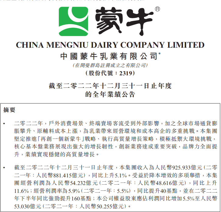 数据显示,2022年,蒙牛实现收入约为为925.933亿元,同比上升5.1%;公司权益股东应占利润为53.03亿元,同比增加5.5%;经营利润为54.232亿元,同比上升11.6%;经营利润率为5.9%,同比提升40基点,并在2022年下半年同比强劲提升160个基点。