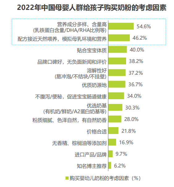 《2022年中国母婴新消费白皮书》显示:“营养成分含量高”、“配方接近天然喂养”以及“贴合宝宝体质”成为消费者购买奶粉考虑因素TOP3。而羊奶因为有“好消化易吸收、营养丰富、低致敏”等天然优势,受到越来越多新生代父母的青睐,更好地满足精细化喂养需求。