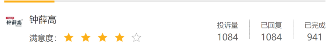 值得注意的是,在近日有消费者投诉称,在便利店购入的雪糕品牌钟薛高里吃出类似头发的物品,十分恶心,并希望有关部门能够调查。据查询,在黑猫投诉平台上,钟薛高的投诉量1084条,已回复量1084条,已完成量941条,满意度四颗星。