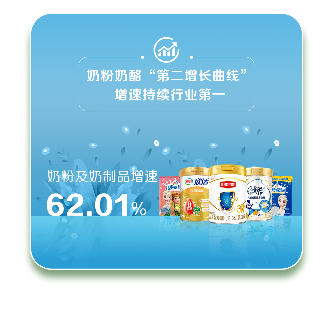 另外,在成人奶粉领域,通过前瞻布局和技术积累,伊利股份已形成大幅领先优势,率先切入成人奶粉“健康+功能”新蓝海赛道。报告期,伊利股份成人奶粉市占份额不仅遥遥领先行业稳居第一,增速也位居行业第一。
