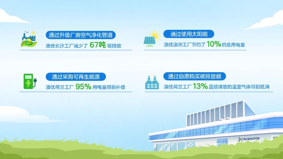 在中国,澳优升级厂房空气净化管道,减少了67吨的碳排放;在荷兰,澳优采用节能照明设备、携手绿色供应商,共同打造绿色供应链,并通过采购可再生能源抵消95%的耗电量,采购碳排放额抵消13%的直接温室气体排放;在澳洲,澳优继续安装更多太阳能板,节省约10%的总用电量。