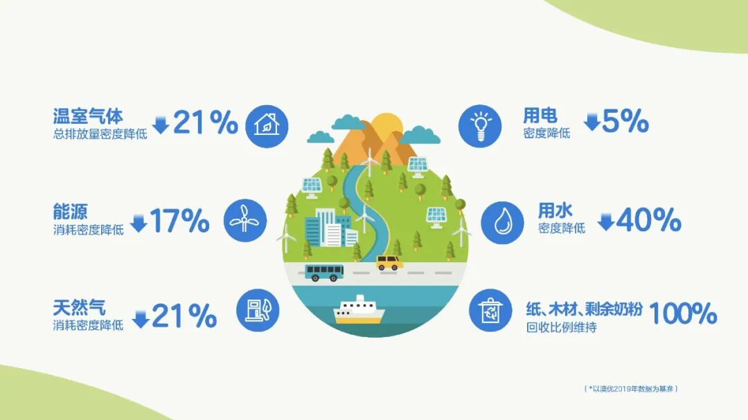 澳优不断完善环保管理体系、严格执行绿色生产等措施,环境绩效逐年提高。以2019年为基准,2022年,澳优温室气体总排放量密度降低21%,能源耗量密度降低17%,耗水量密度降低40%,纸、木材、剩余奶粉回收率100%,提前完成公司2025年可持续发展承诺。