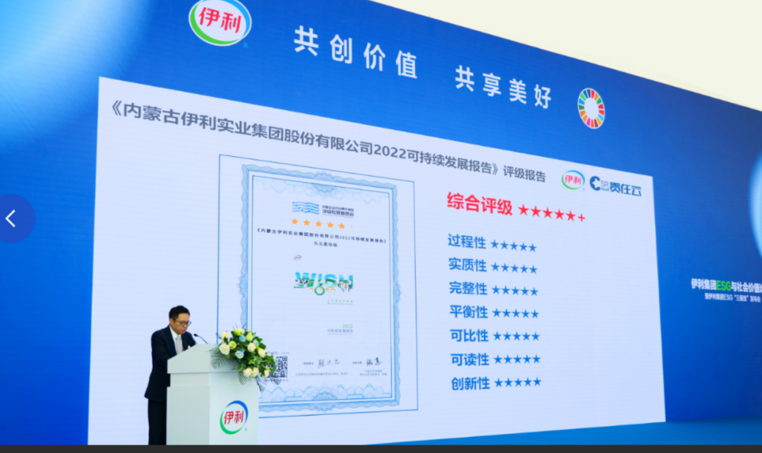 中国社科院教授、责任云研究院创始院长钟宏武,宣布经过对过程性、实质性、完整性、平衡性、可比性、可读性、创新性七个方面的综合评价,“《内蒙古伊利实业集团股份有限公司2022可持续发展报告》为‘五星佳’级,是一份典范的企业社会责任报告。”