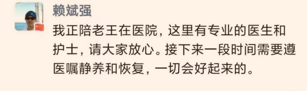 前美团高管赖斌强也发朋友圈表示“正陪老王在医院,这里有专业的医生和护士,请大家放心。接下来一段时间需要遵医嘱静养和恢复。”