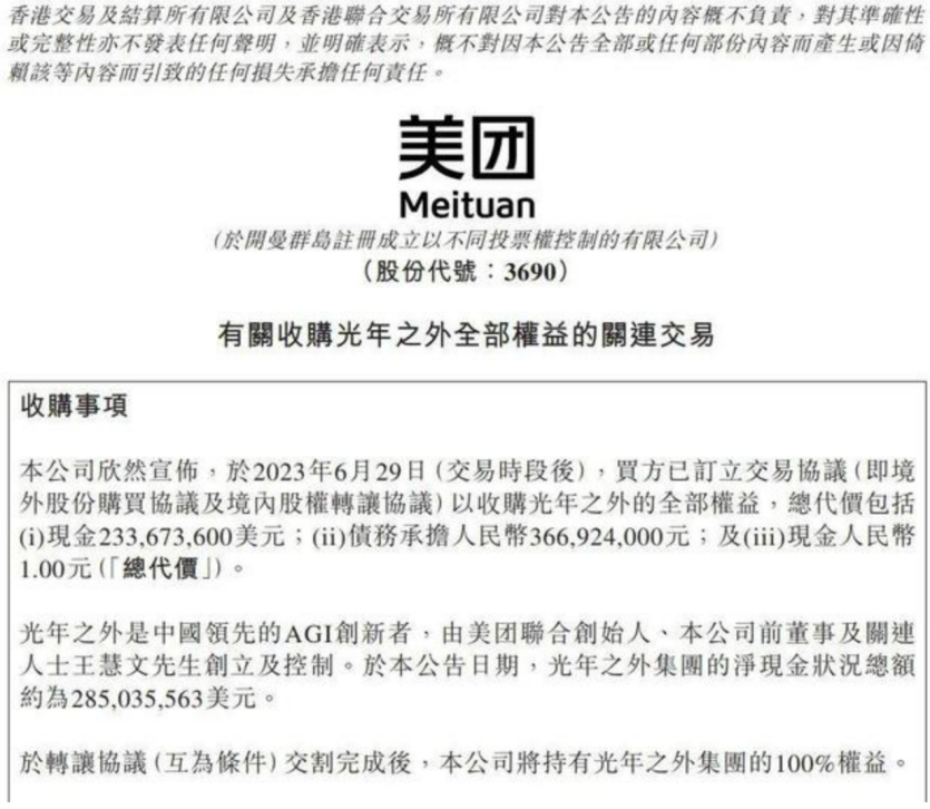 虽然王慧文由于个人健康原因暂别光年之外,但光年之外的经营却并不能按下“暂停键。在6月29日,美团发布公告称,已完成光年之外境内外主体100%股权的收购,收购价约为20.65亿人民币。至此,创立仅四个多月的光年之外就被王慧文的老东家美团高价收购。