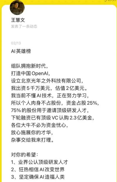 而在退休两年之后的今年 2 月 13 日,王慧文在社交 App 即刻上宣布要进行“大模型创业”,并个人出资5000万美金占股 25%,成立北京光年之外科技有限公司,剩余 75% 的股份用于招揽顶级 AI 人才,争取 OpenAI 这样的伟大突破,也能在中国率先发生。