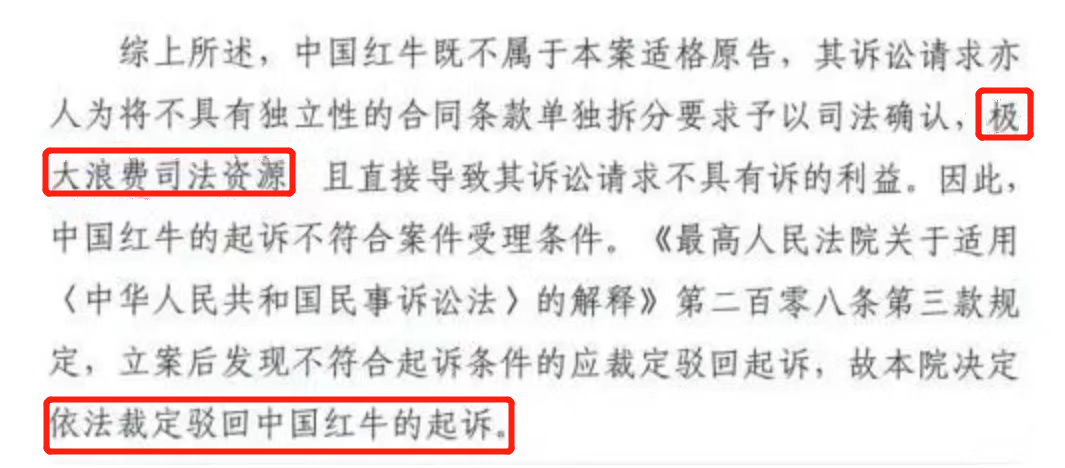 此外,法院表示其诉讼行为本身存在悖论、红牛维他命公司是合同客体而并非合同主体,红牛维他命公司反客为主,不是本案适格原告,红牛维他命公司的拆分条款分别诉讼的行为极大浪费司法资源,且直接导致其诉讼请求不具有诉的利益。