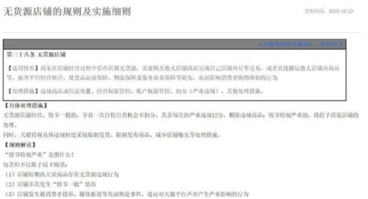 而各大电商平台也早就针对无货源网店给出了相应措施。2020年10月22日天猫平台颁发无货源管控细则。并于2023年4月再次升级管控:大部分无货源的天猫店铺都被抽检,目前有第一次不扣分的,有第二次扣12分的,也有大批已经第三次面临48分封店的。