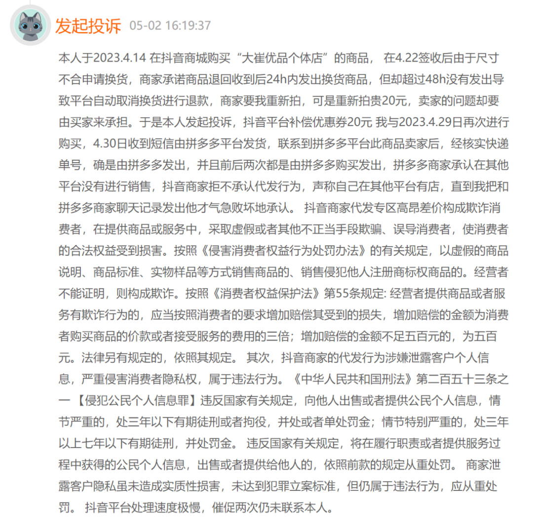 此外,在黑猫投诉平台上关于无货源网店的投诉也是数不胜数。5月2日有消费者投诉称“本人于2023.4.14 在抖音商城购买“大崔优品个体店”的商品,在4.22签收后由于尺寸不合申请换货,商家要求重新拍,4.29日再次进行购买,4.30日却收到短信由拼多多平台发货,联系到拼多多平台此商品卖家后,经核实快递单号,前后两次都是由拼多多购买发出,拼多多商家表示在其他平台没有进行销售,抖音商家拒不承认代发行为,声称自己在其他平台有店,直到我把和拼多多商家聊天记录发出他才气急败坏地承认。”