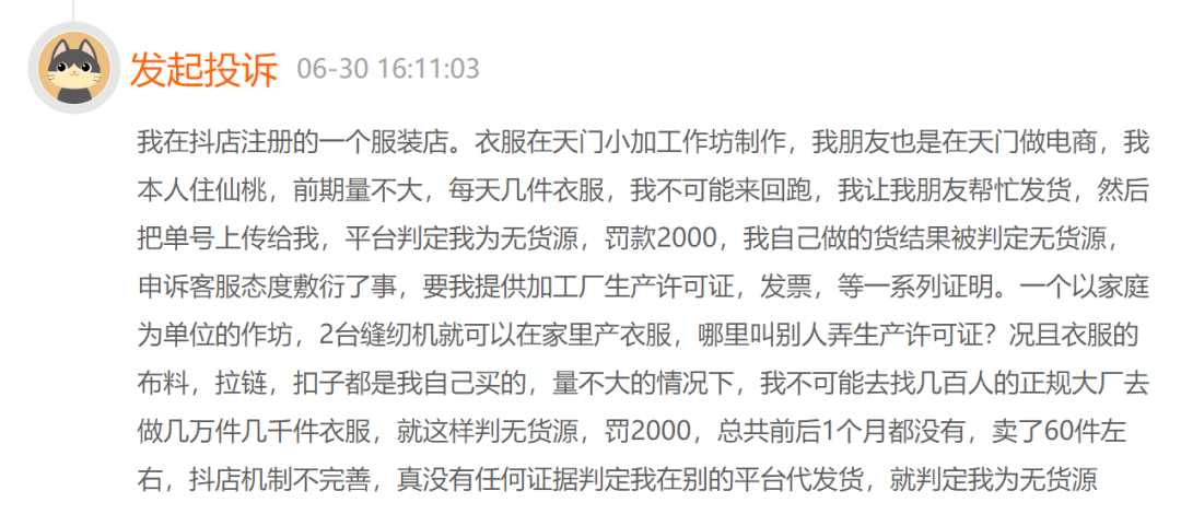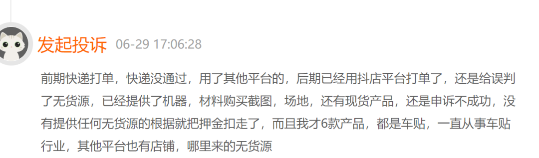 6月29日也有商家投诉称被误判无货源,提供机器、材料购买截图以及场地和现货产品,但最终仍申诉不成功。投诉要求撤销处罚,涉诉金额2000元。抖音平台于6月30日回复,至今并未显示解决。