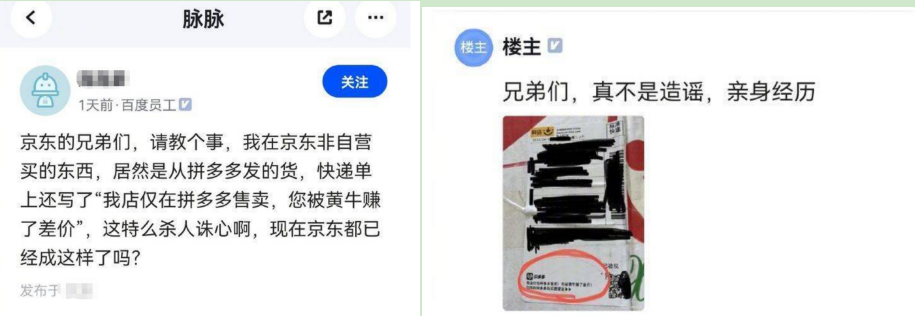 然而这并不是个例,前段时间黄牛赚差价“杀人诛心”事件在当时也是火热一时。4月10日,微博博主王落北爆料称,百度员工在京东下单,收到快递竟然显示拼多多发货。而发货单上还明晃晃的写着“我店仅在拼多多售卖,您被黄牛赚了差价”。该百度员工表示,这是杀人诛心啊。
