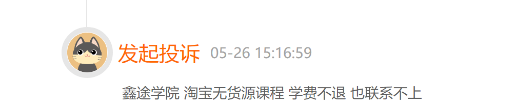 黑猫投诉平台显示,5月26日,有创业者投诉称淘宝无货源课程学费不退,也联系不上,涉诉金额6899元,而黑猫投诉平台也并未联系到商家。