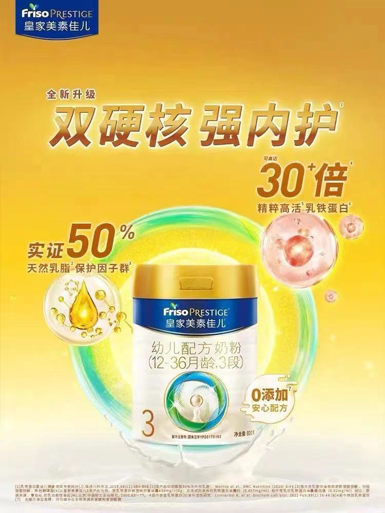 据了解,今年菲仕兰旗下皇家美素佳儿全新升级并完成二次配方注册,其含有的天然乳脂和乳铁蛋白这两个硬核成分,能为宝宝带来超强内护:实证50%天然乳脂保护因子群,含近40种天然乳脂保护因子,支持内在环境调节和细胞调节;可高达30+倍精粹高活乳铁蛋白,充分保留了乳铁蛋白的活性,菲仕兰自家乳铁蛋白原料铁结合率达到80%以上;此外,新国标配方0添加香兰素,给宝宝带来天然营养。