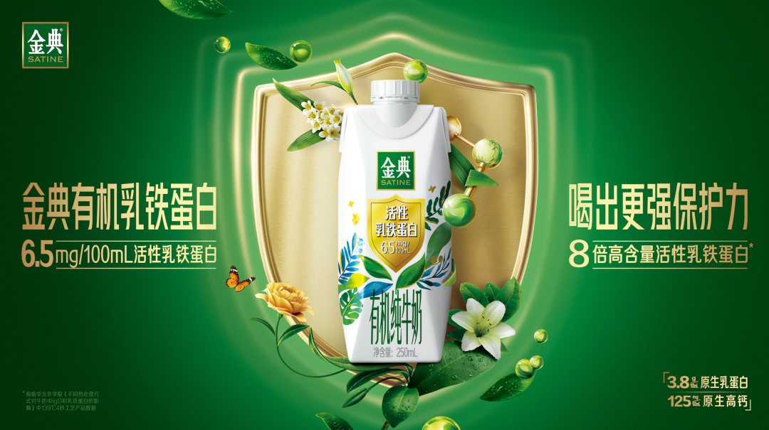 金典有机乳铁蛋白牛奶采用伊利股份研发的乳铁蛋白定向保护技术,相比传统 UHT 工艺的常温牛奶,新技术实现了 8 倍乳铁蛋白的保存。不仅实现了批量生产,大大降低了消费者摄取乳铁蛋白的成本,还以创新产品守护国民健康防线,开辟了灭菌乳产品中的新品类。