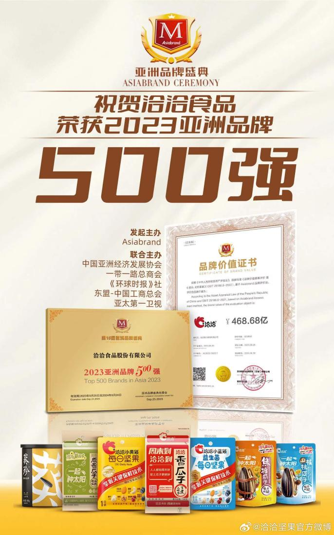 与此同时,品牌在国际市场的影响力不断提升,成为出口国家最多、出口区域最广的民族品牌之一。在9月举办的“第18届亚洲品牌盛典”上,洽洽也成功上榜“2023亚洲品牌500强”。