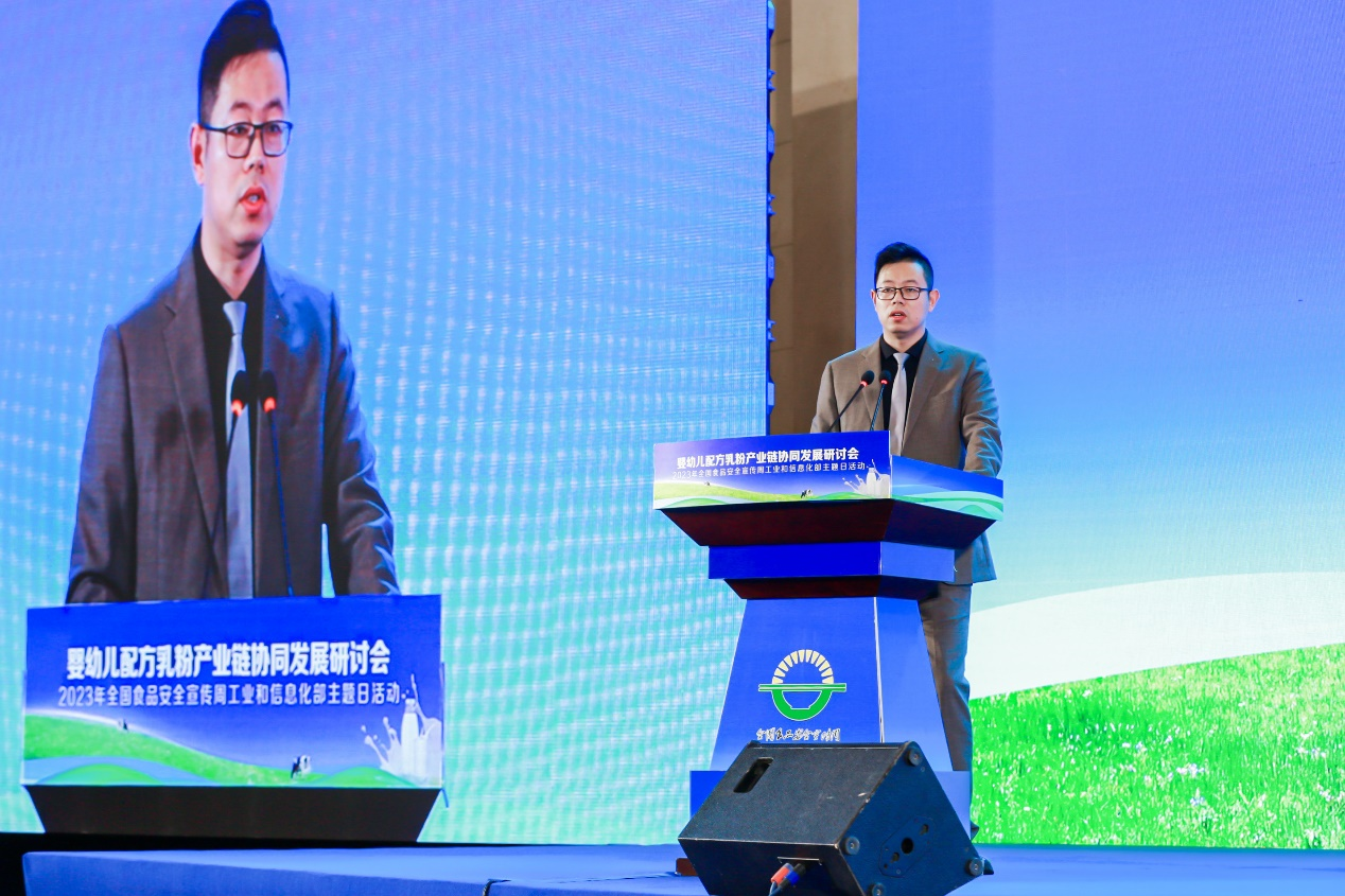 在会议上,越秀辉山奶粉事业部销售部经理于游发表了以“锚定品质为先,走好高质量特色发展之路”为主题的演讲分享,充分介绍了辉山奶粉在提升产品品质、做优做强企业等方面的典型经验。他介绍到,依托着越秀辉山的全产业链一体化生产模式,辉山奶粉实现了奶源100%来自规模化自营牧场,每一个产品的诞生都要经历60道质量检测,涵盖220项指标。2014年,由工信部牵头的国家级“食品工业企业质量安全追溯平台”开通,辉山等6家乳企首批加入。经数年的数字化建设,在生产环节,越秀辉山利用智能追溯平台,实现了追溯状态监控功能,对供应商、生乳、投料、发货、设备、工艺、仓储、运输、检验等信息群进行全产业链全程追溯。针对流通追溯环节,越秀辉山则从经销、分销、终端各节点产品数据进行追溯利用,实现追溯、防窜、营销三码合一,提升用户消费体验的同时,更助力渠道有效管控产品流向、稳定产品价盘、保证门店经营秩序。