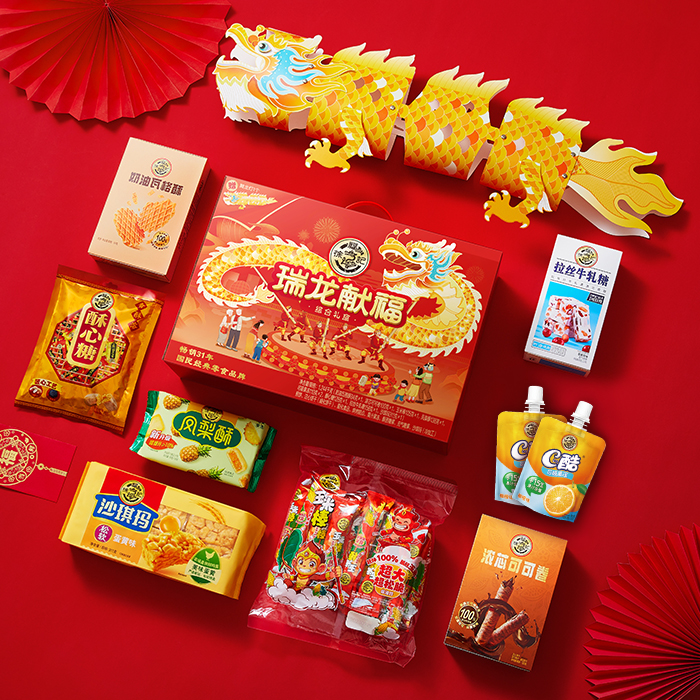 除此之外,徐福记还推出了性价比满满的礼箱系列,有一箱集齐徐福记所有品类、具有高性价比和质价比的全家福礼箱系列,还有针对生肖主题的瑞龙献福礼箱,设计采用舞龙传统文化,附赠非遗舞龙灯,不仅有寓意有颜值,年味十足。