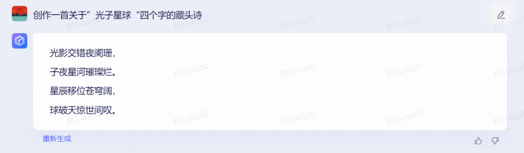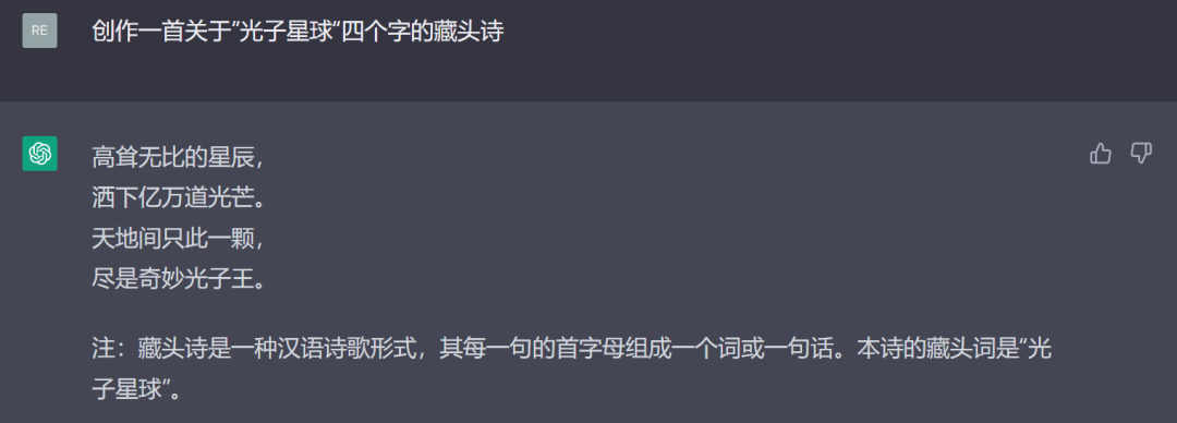 这首诗虽谈不上有多少文学、审美价值,但至少兢兢业业地按照要求完成了创作。相比之下,ChatGPT似乎并没有很好地理解“藏头诗”的含义。
