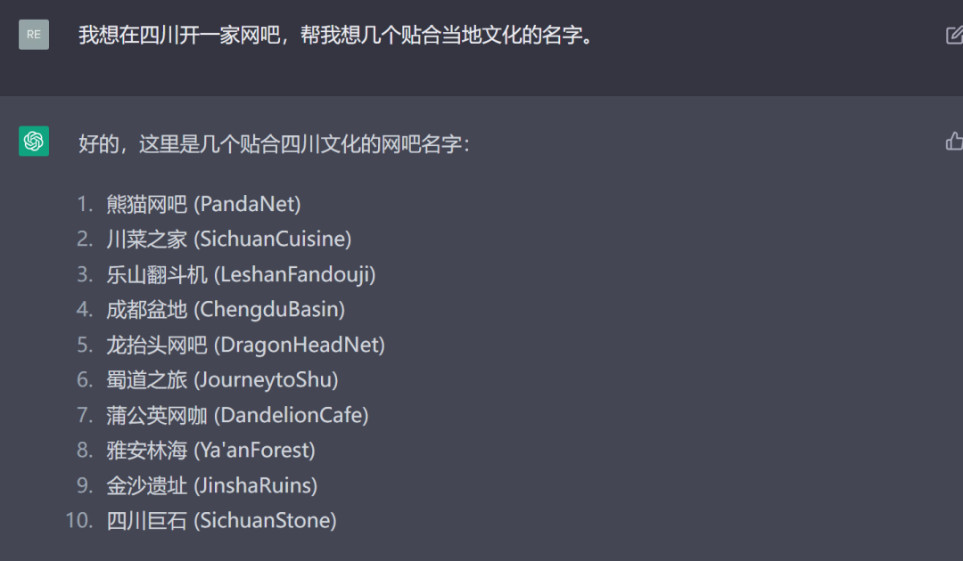 同样的逻辑,在贴合本地文化的网吧取名中同样有所体现。文心一言的回答,显然比ChatGPT毫无逻辑的回答要精准。