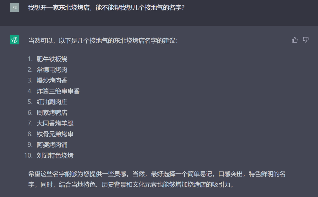 提问是东北烧烤,但ChatGPT的回答似乎有些驴头不对马嘴,将串串香、烤鸭等五湖四海的美食汇聚一堂。相比之下,文心一言的回答不仅到位许多,甚至还呈现出了不同答案的取名逻辑。