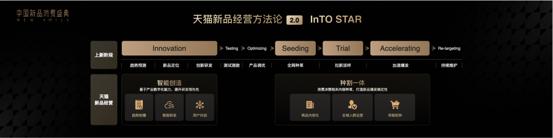 天猫以新品生命周期的视角推出天猫新品经营方法论2.0:InTO STAR,把新品从0到1,再到100的各个场景进行全链路打通,整合天猫各业务能力,为品牌提供一站式服务,提高新品的成功率。
