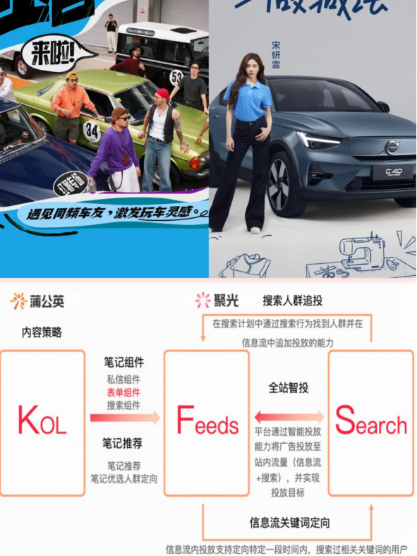 左上为小红书红薯车友会IP;右上为volvo C40开屏广告;下方为蒲公英KFS逻辑