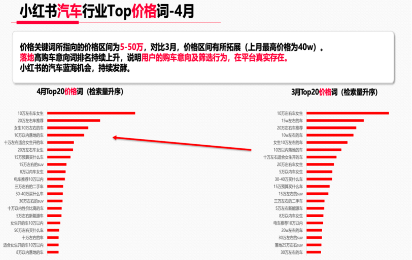 从另一份关于小红书用户关于汽车相关搜索的词频榜单,我们也能看到诸多有价值的信息。从3月和4月top2-价格词的变化可以看到,用户在小红书上的关注详情。