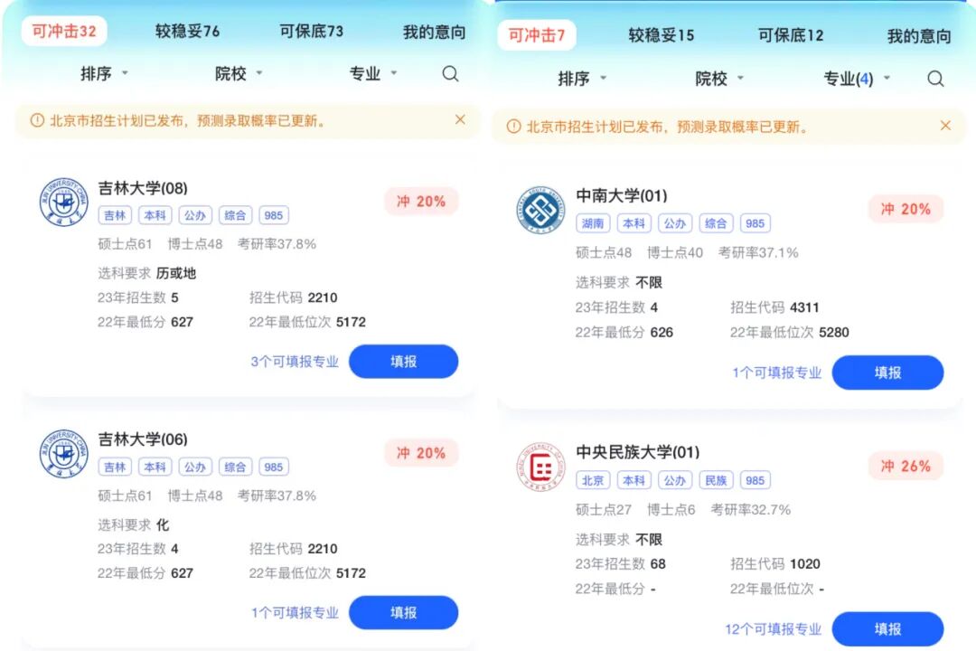 AI志愿助手通过打通院校与意向专业数据,同时根据考生省份、分数、选科情况,智能推荐“冲、稳、保”的录取概率。在检索结果页中,呈现了目标院校/专业的硕博点情况和去年最低位次情况。考生可以多维度筛选后,一键完成填报动作。