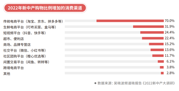 年轻群体对时效、服务及线上化的追求正在加速推动生鲜电商的普及率。调研数据显示,2022年新中产购物比例增加的消费渠道,除传统电商平台外,包括美团买菜、盒马、叮咚买菜等在内的生鲜电商平台的增加比例达到31.9%,远远领先商超等线下模式。