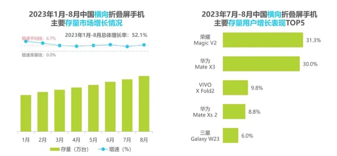 艾瑞咨询报告亦指出,2023年7月-8月,荣耀Magic V2以31.3%存量用户增长率位居横向折叠屏手机市场头名。
