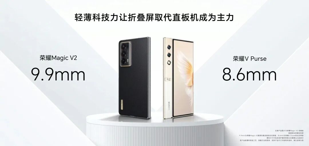 以荣耀Magic V2为例,4.7mm的展开态厚度,9.9mm的折叠态厚度,首次将折叠屏厚度带入“毫米时代”;荣耀Magic Vs2则凭借229克的机身重量,刷新了大屏内折手机的轻薄纪录。