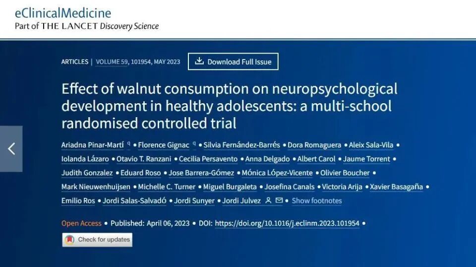 日前,上述研究结果发表在《柳叶刀》子刊《临床医学》杂志上,论证了核桃可有效促进青少年神经心理和行为发展。