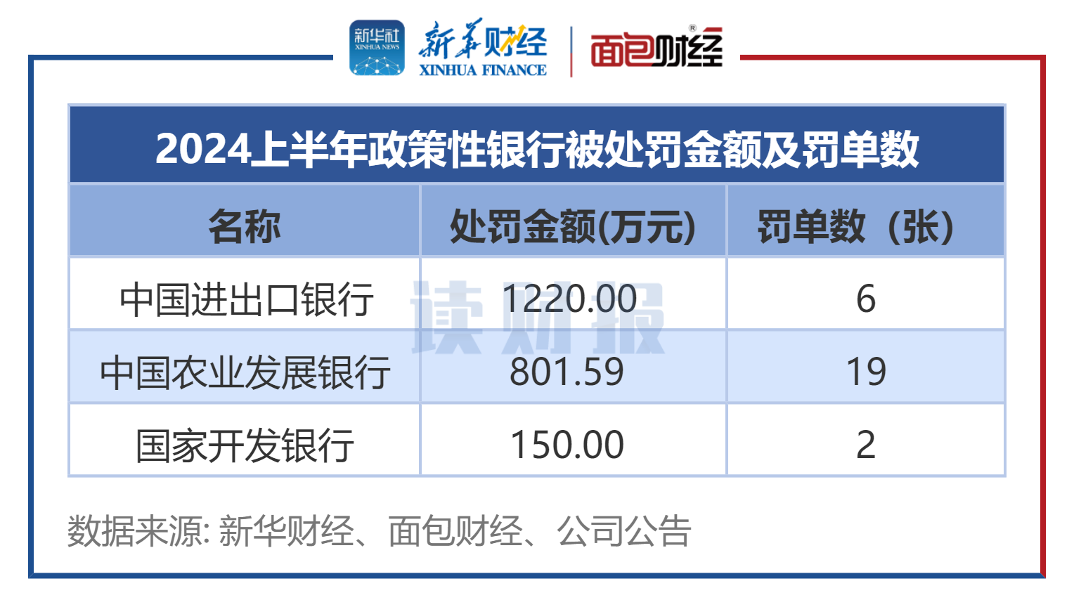 2024年上半年,涉及中国农业发展银行及其分支机构的罚单有19张,居于政策性银行首位;罚没金额合计801.59万元,其中,涉及1张160万元大额罚单。